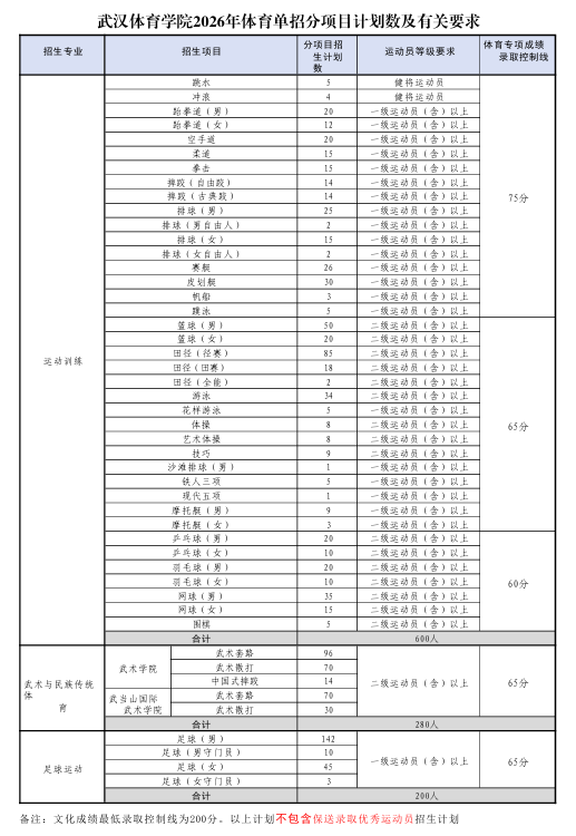 1.经学校研究决定运动训练、武术与民族传统体育、足球运动专业文化成绩最低录取控制线为200分,体育专项成绩最低录取控制线请查看本招生简章第二部分“分项目计划数及有关要求”。