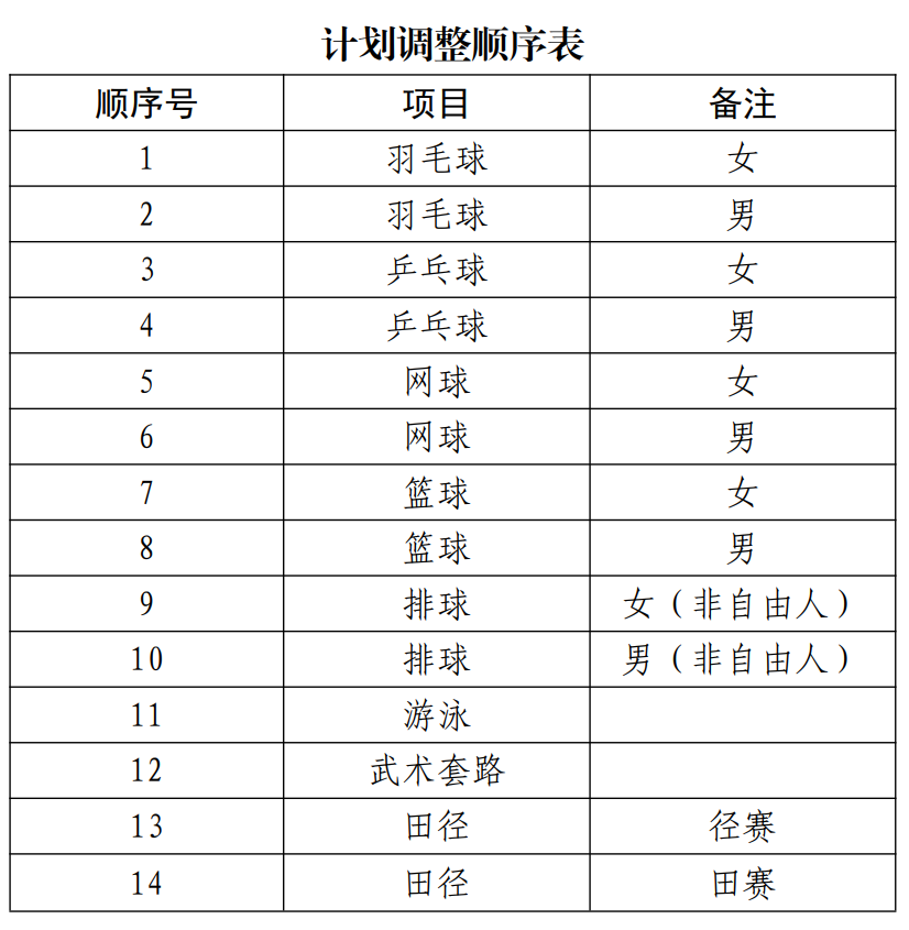 1.运动训练:田径(除竞走)、篮球、排球、乒乓球、羽毛球、网球、游泳、蹼泳(单蹼)、跳水、赛艇、皮划艇静水、皮划艇激流回旋、帆船、摩托艇、跆拳道、拳击、摔跤(自由式、古典式)、柔道、体操、艺术体操、技巧、围棋、铁人三项、沙滩排球、空手道、花样游泳、冲浪、*现代五项。